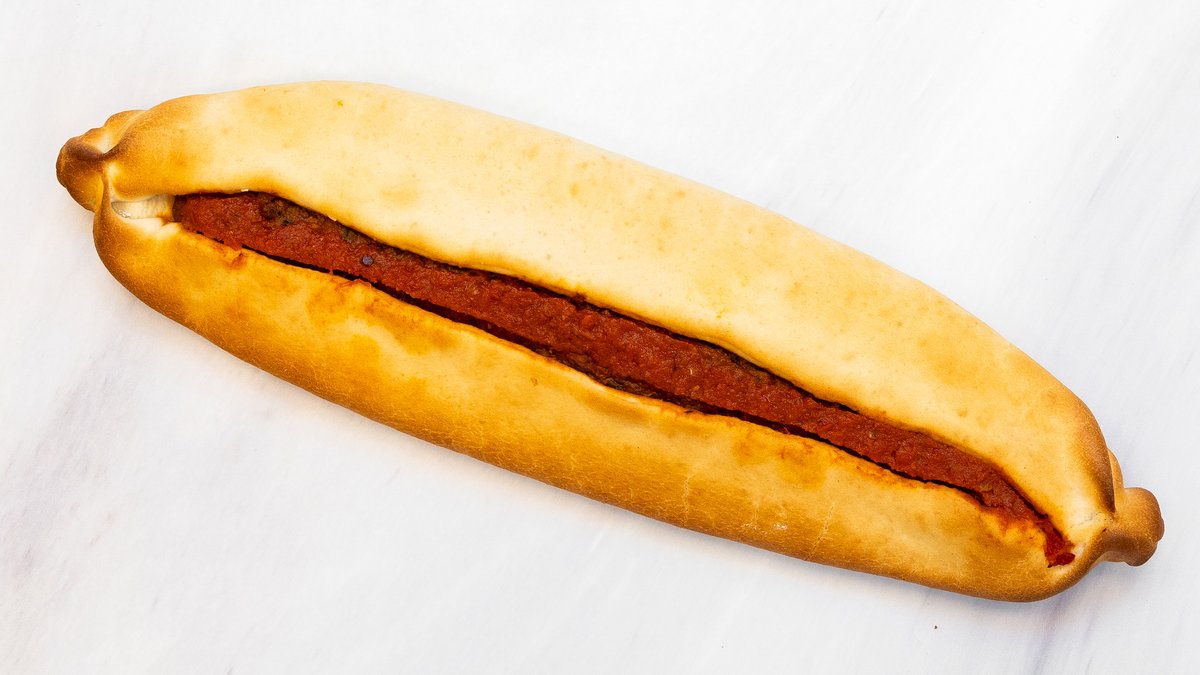 Pirog med kebabkött, riven ost och Café Libas egna tomatsås.