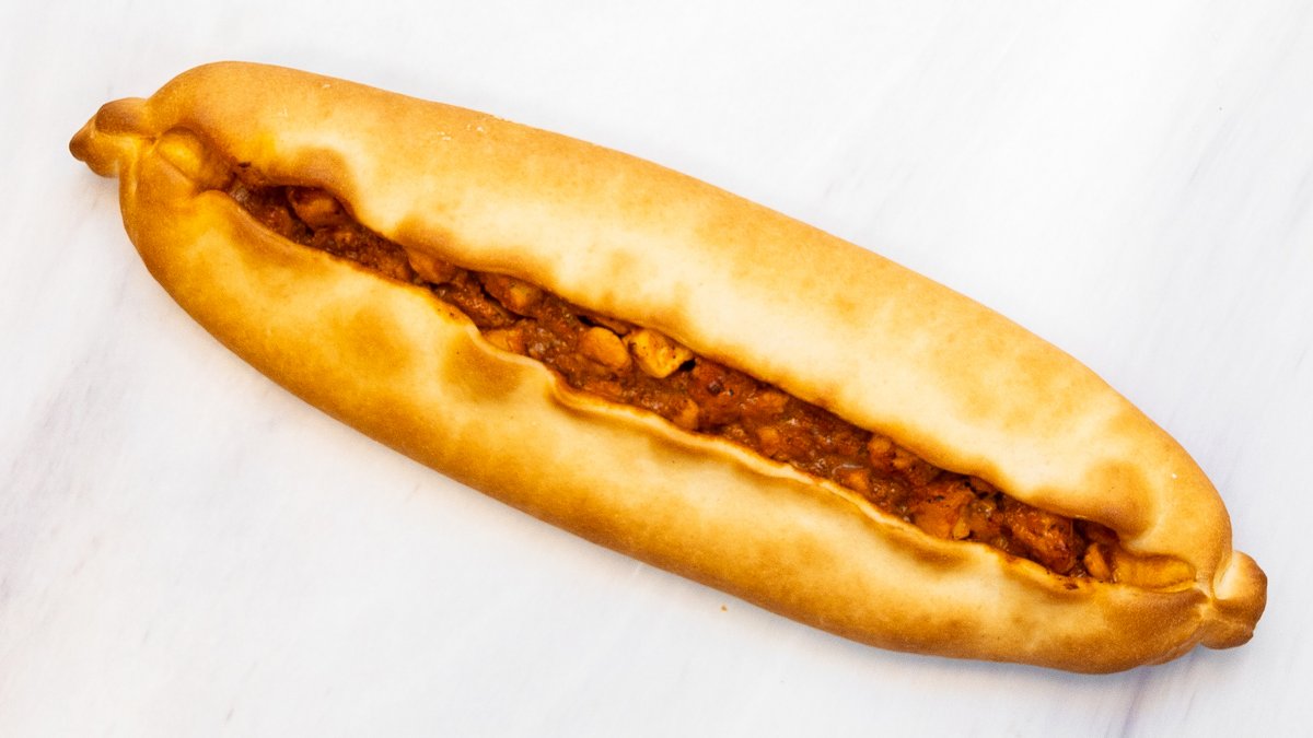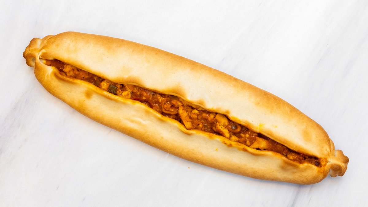 Pirog fylld med stekta kycklingbitar, vår egna tomatsås, toppad med riven ost.