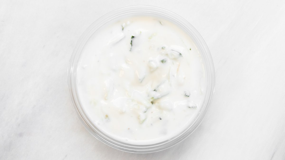 Yoghurtröra med riven gurka, vitlök och svartpeppar.