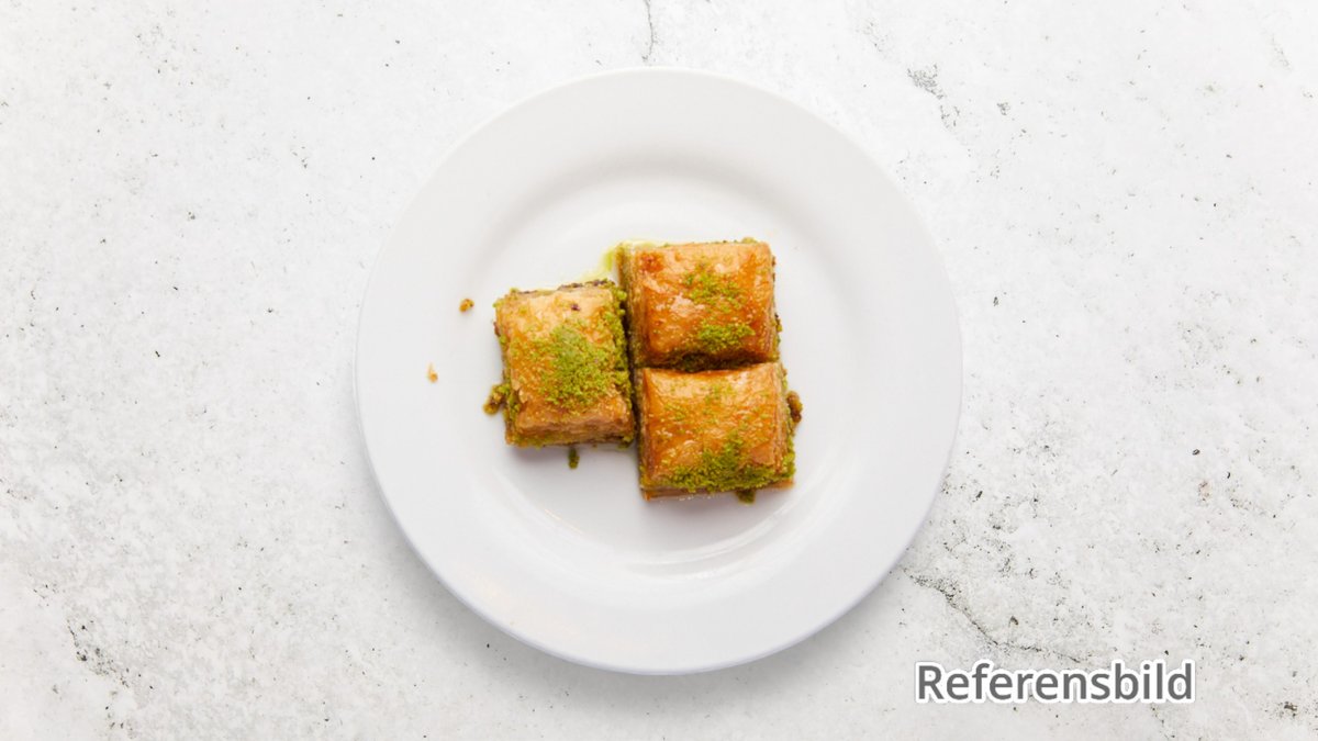 Orientaliskt bakverk av smördeg med ashtafyllning (ost) toppad med sirap och pistagenötter.