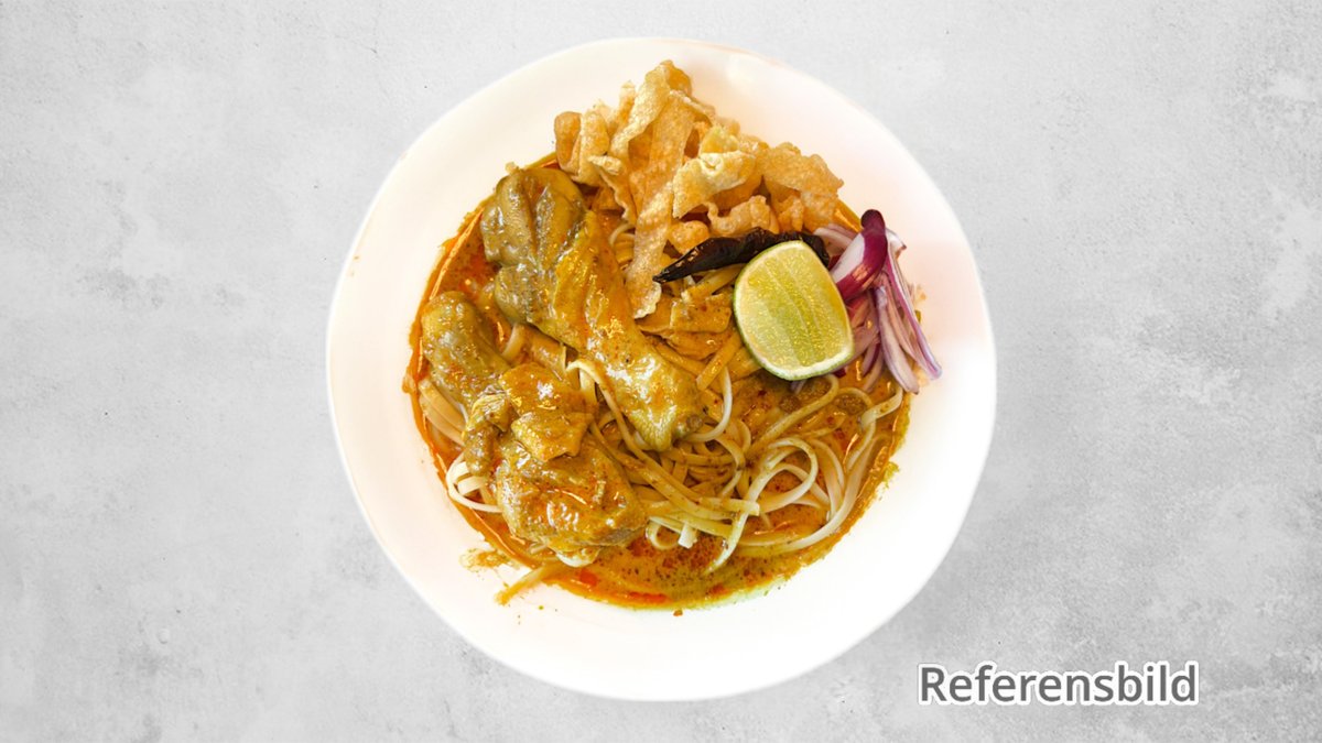 Nordthailändsk panang curry gryta med färska äggnudlar, böngroddar, lime och skivad rödlök. Toppas med krispiga nudlar.