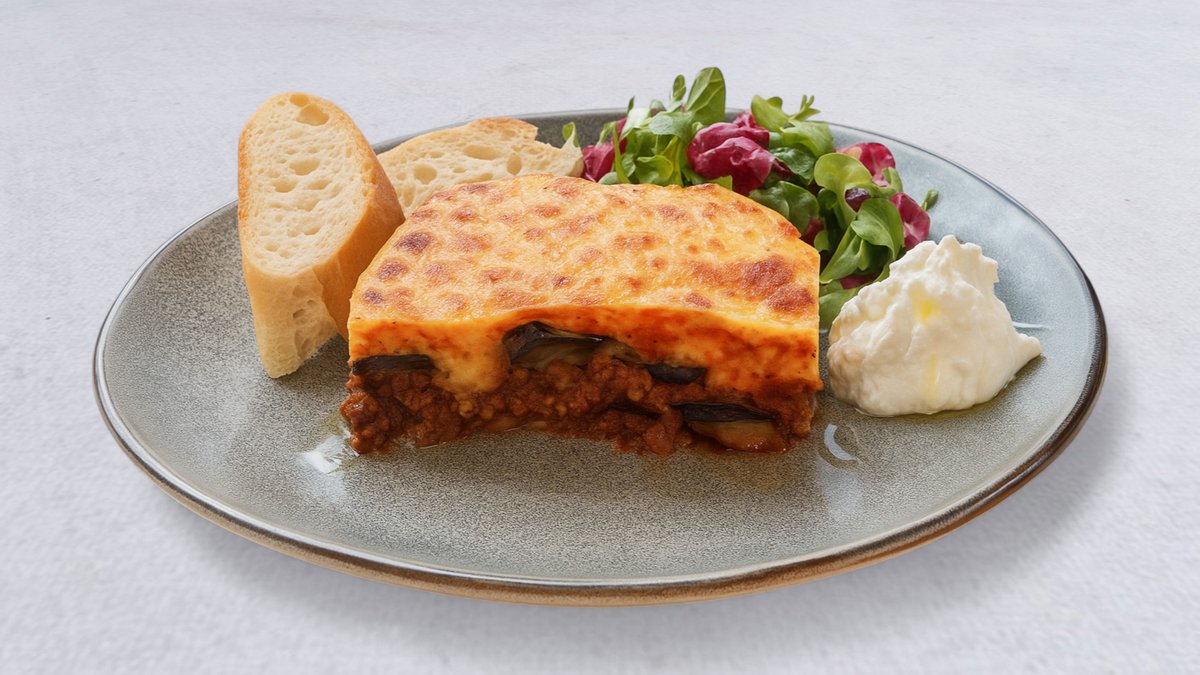 Den klassiska grekiska gratängen med aubergine, potatis och köttfärs i en rik tomatsås, toppad med krämig bechamelsås.