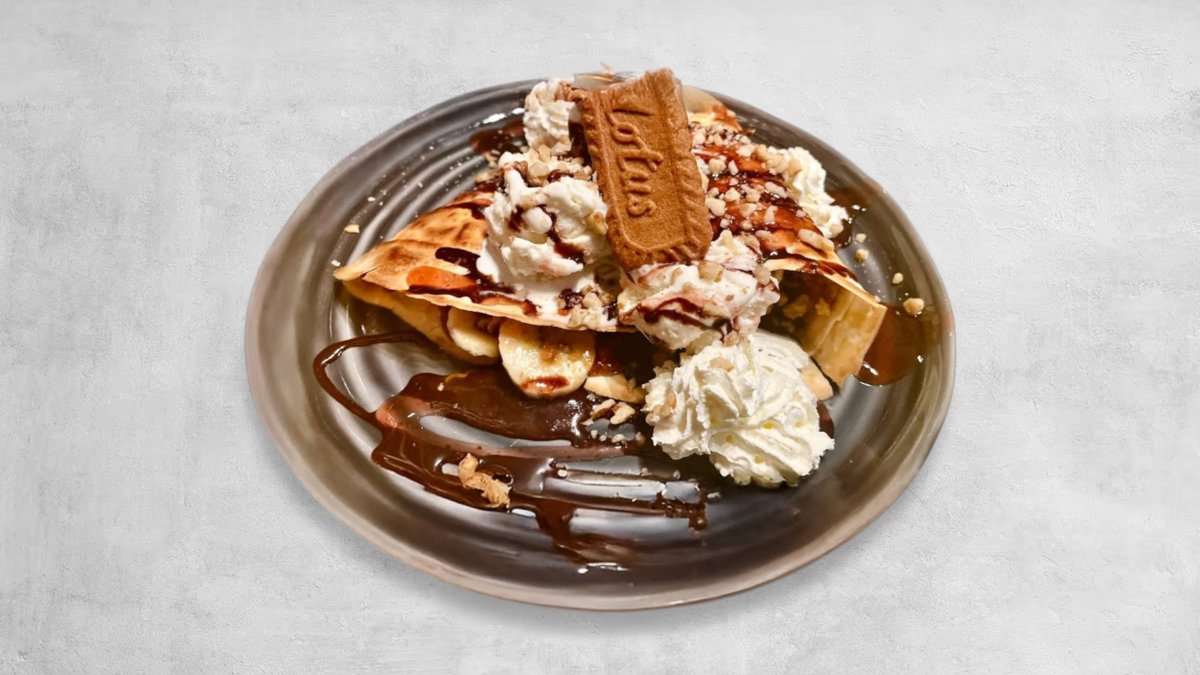 En ny favorit! Nystekt crêpe fylld med krämig Biscoff (kakkräm), färsk banan och krossade Biscoff-kex. Serveras med vispgrädde och karamellsås. Perfekt balans mellan sötma och crunch – ett måste att prova!