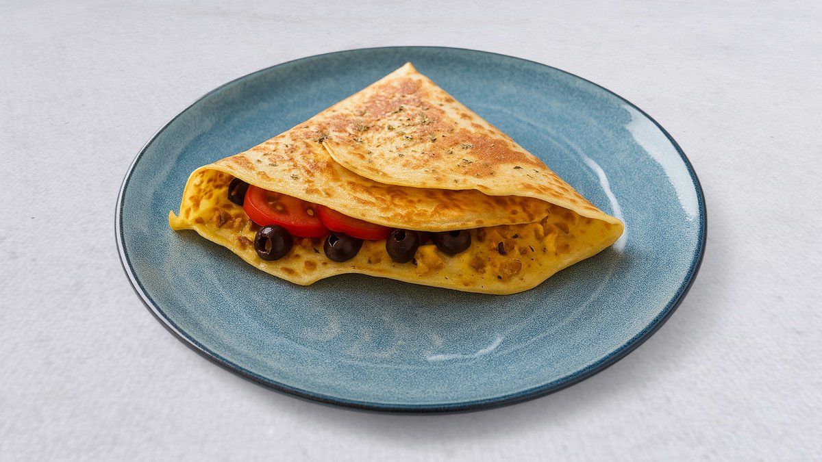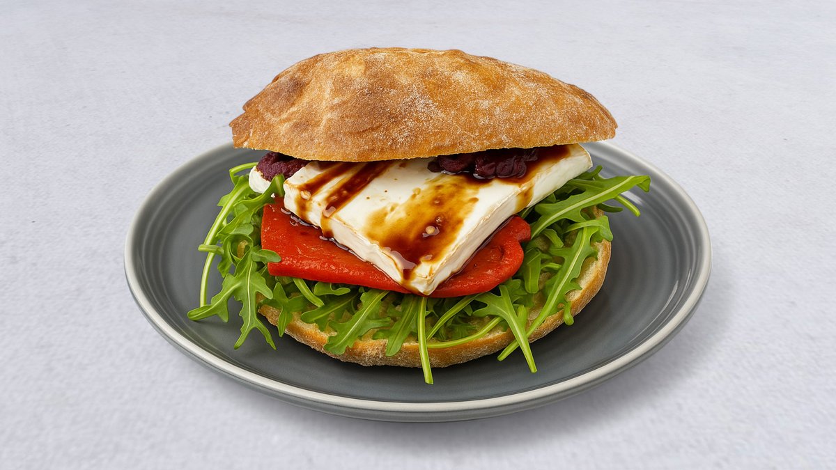 Panini bröd, fetaost, grillad paprika, olivtapenad, ruccola, balsamico.