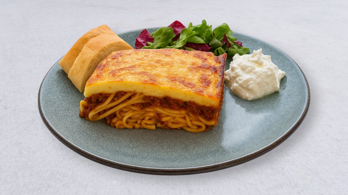 En grekisk pastagratäng med köttfärs och en krämig sås, liknande lasagne men med en unik smakprofil.