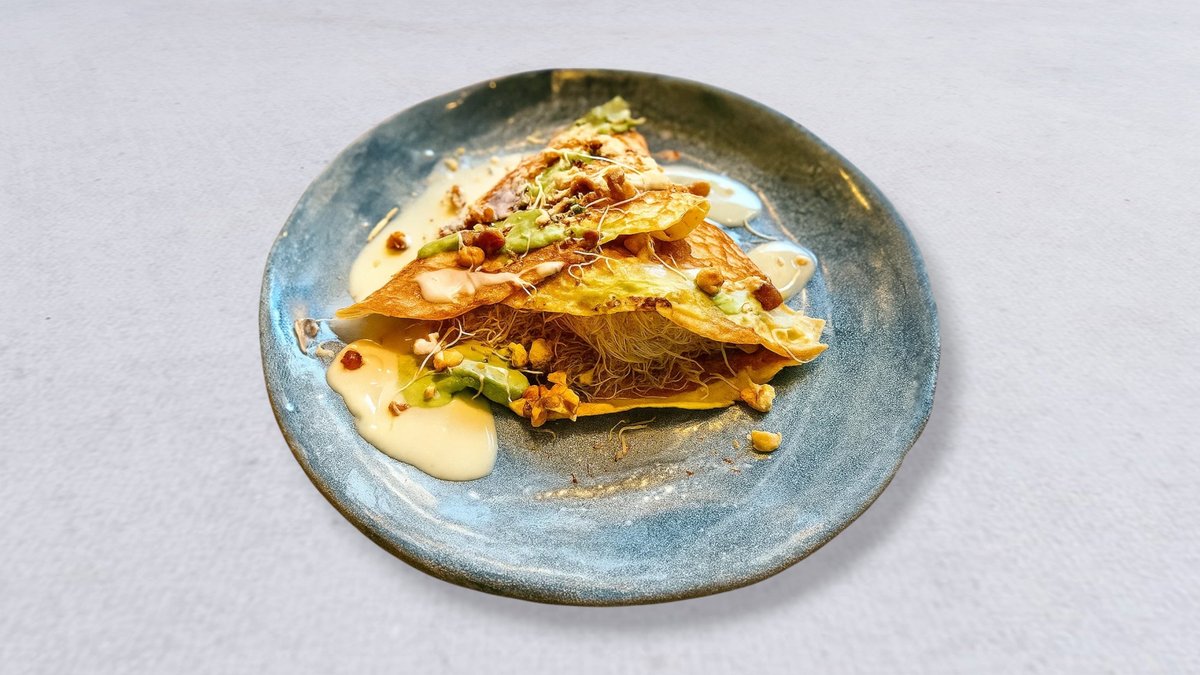 Hasselnötskräm, pistachkräm, vitchokladsås, kadayififyllning och valnötter.