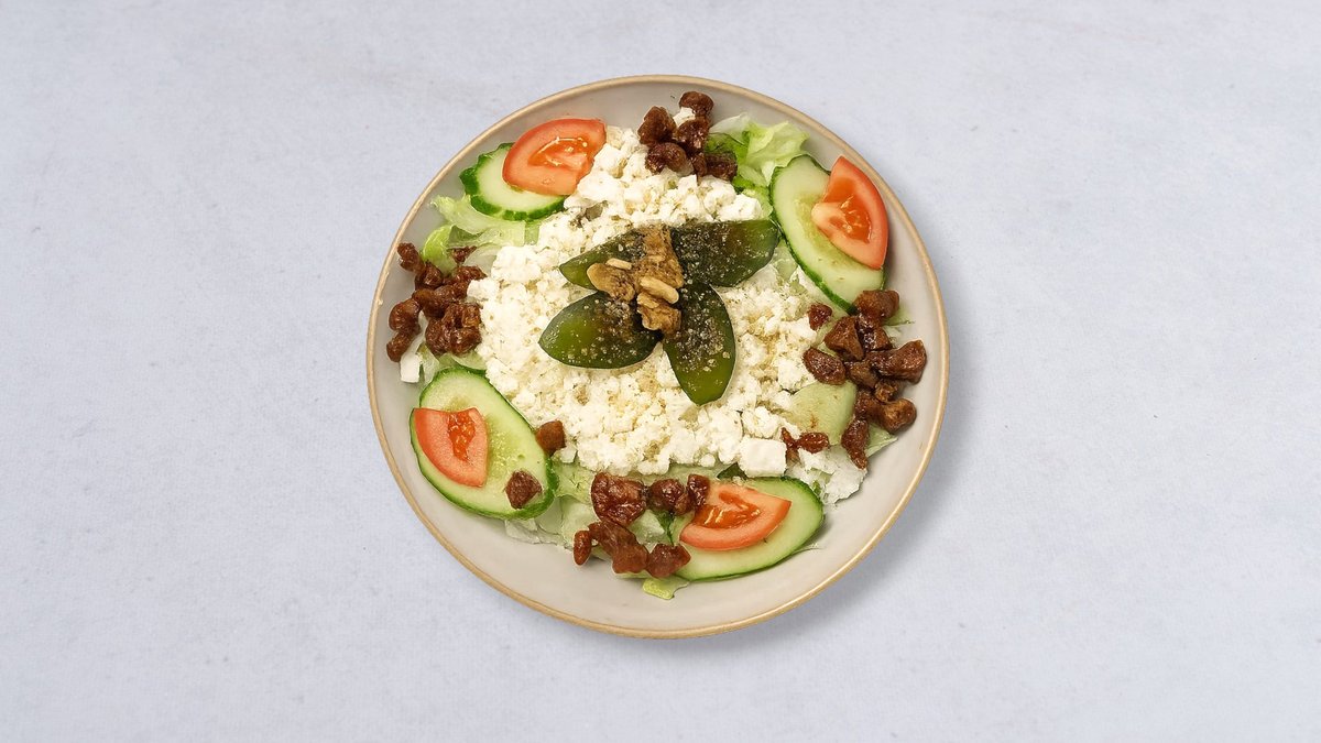 Fetaost, tomat, gurka, oliver, rödlök, mix grönsallad och oregano.