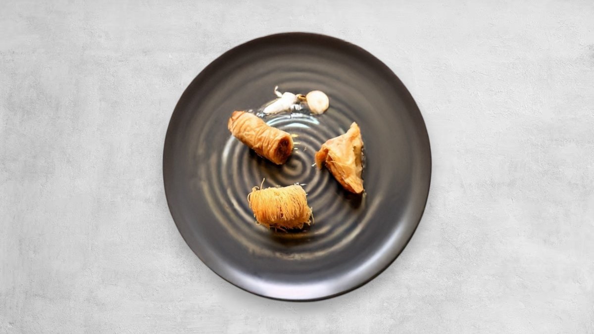 Ett litet fat med tre traditionella grekiska dessertbitar: baklava, saragli och kataifi. Perfekt att dela eller som en söt avslutning på måltiden.
