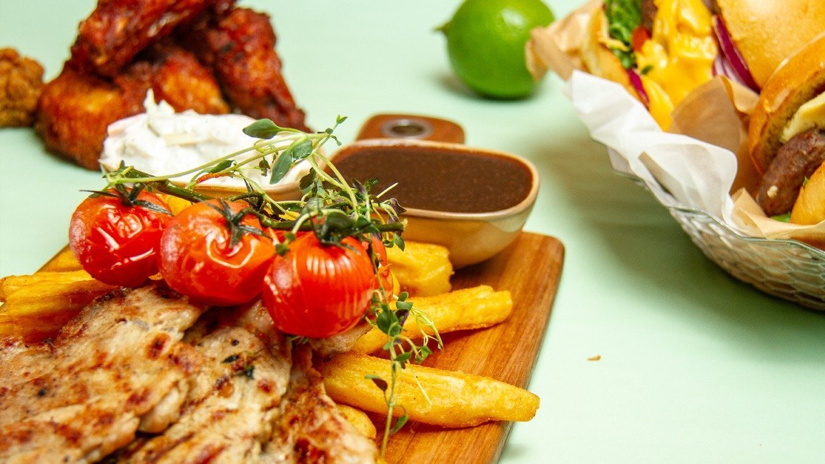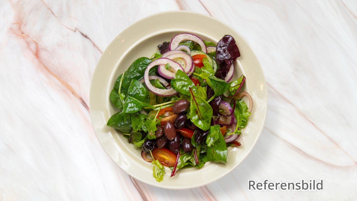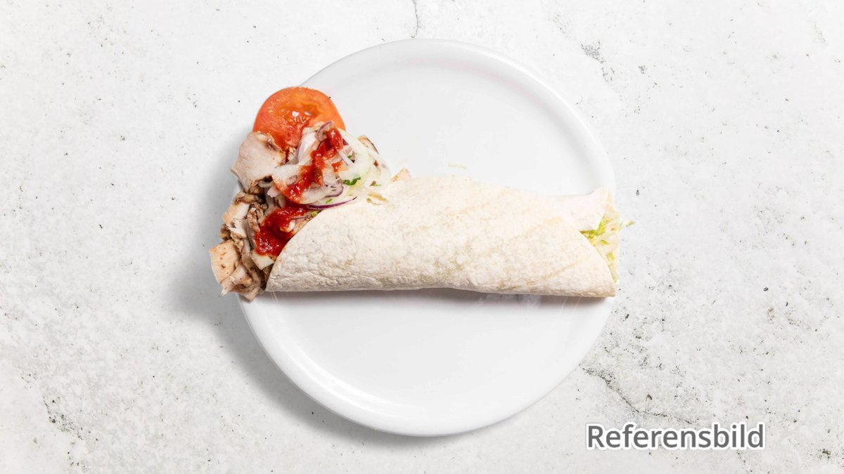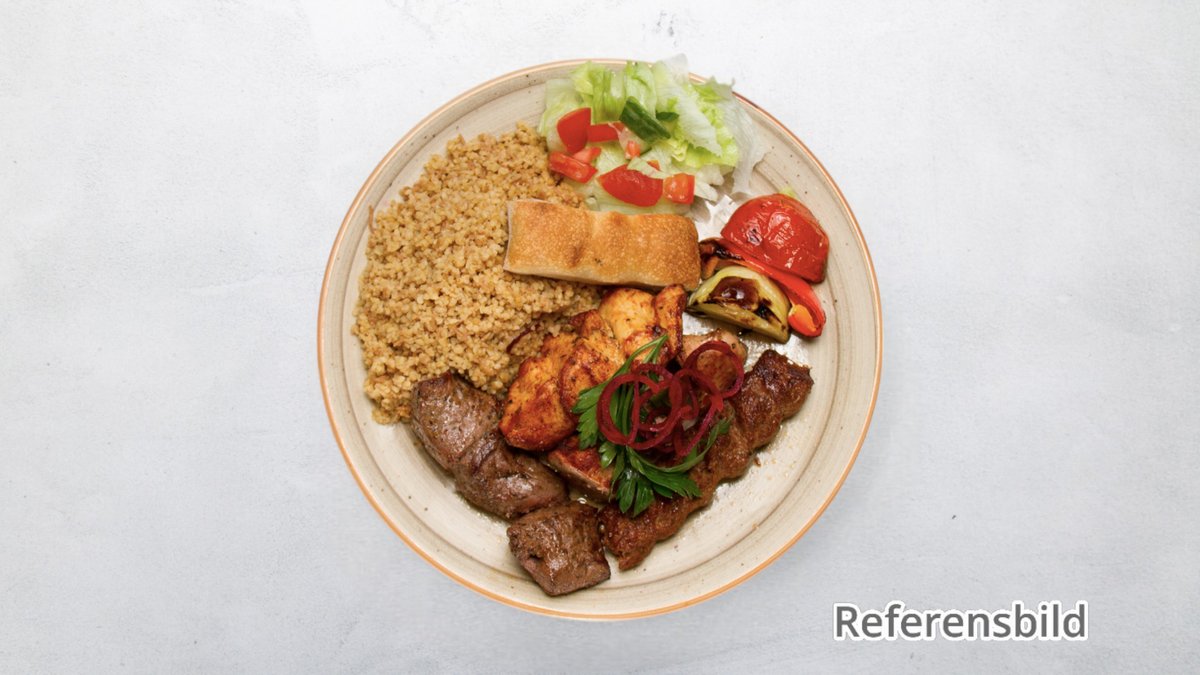 Kebab, rödlök, feferoni, mixsallad, cocktailtomater, gurka, bröd och valfri sås.