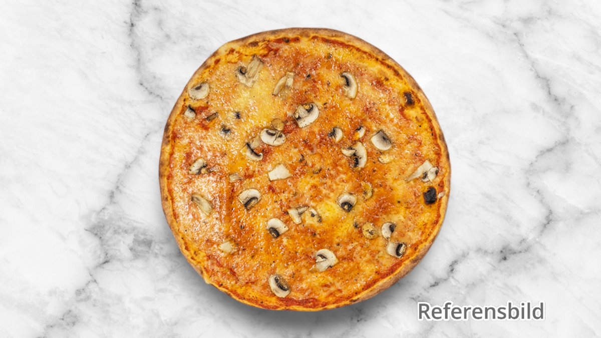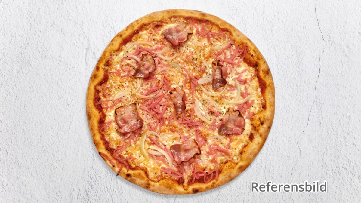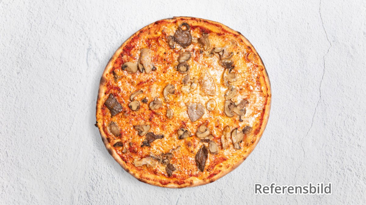 Tomatsås, ost, köttfärs, skinka, champinjoner och lök.