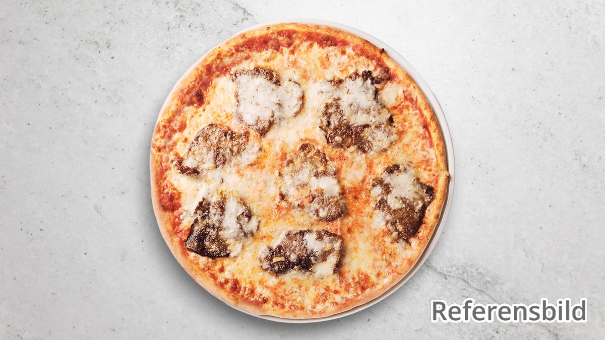 Tomatsås, ost, oxfilé, champinjoner, vitlök, lök, tacosås, jalapeño och kebabsås.