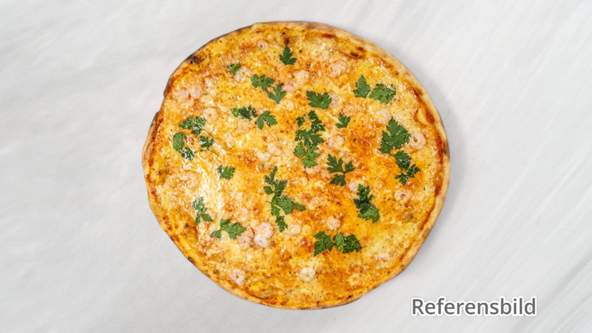 Tomatsås, ost, skinka, ananas och handskalade räkor.