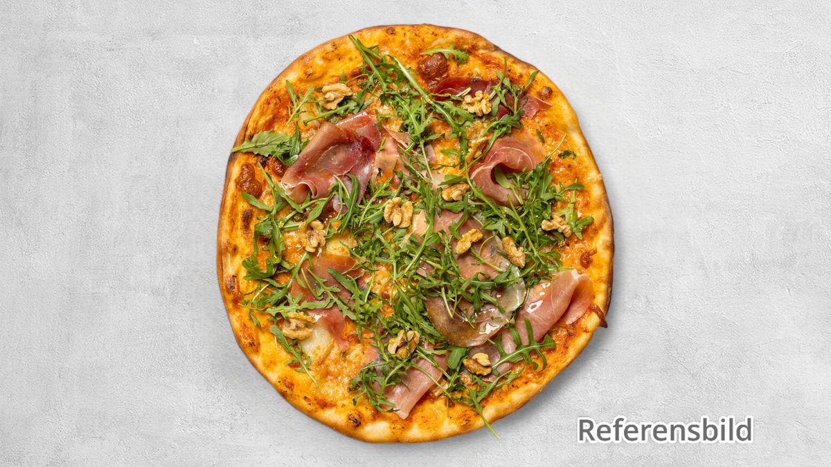 Tomatsås, mozzarella, räkor, ruccola, cocktailtomater och pesto.
