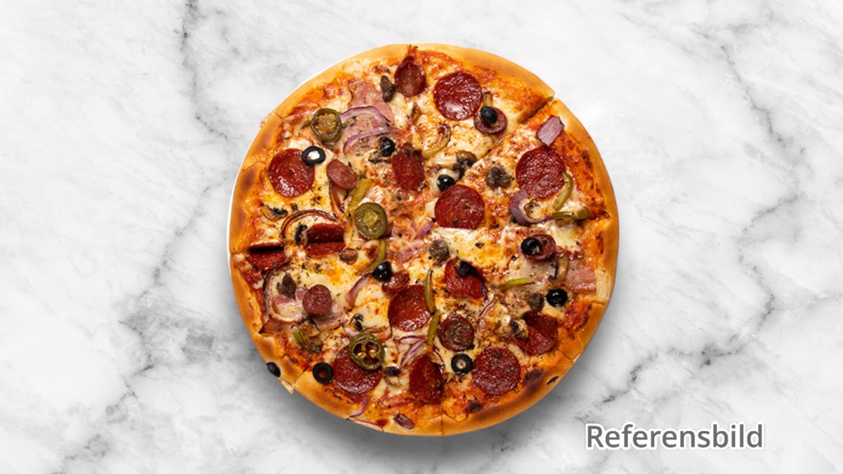 Tomatsås, ost, köttfärs, pepperoni, lök och feferoni.