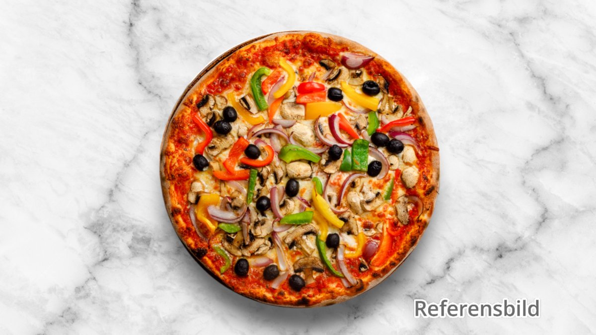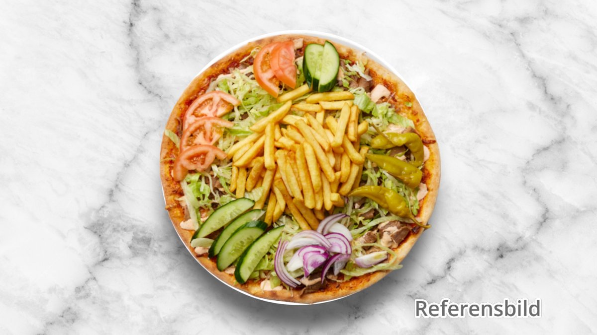 Tomatsås, ost, champinjoner, kebab, sallad, gurka, tomat, paprika, rödlök och feferoni.