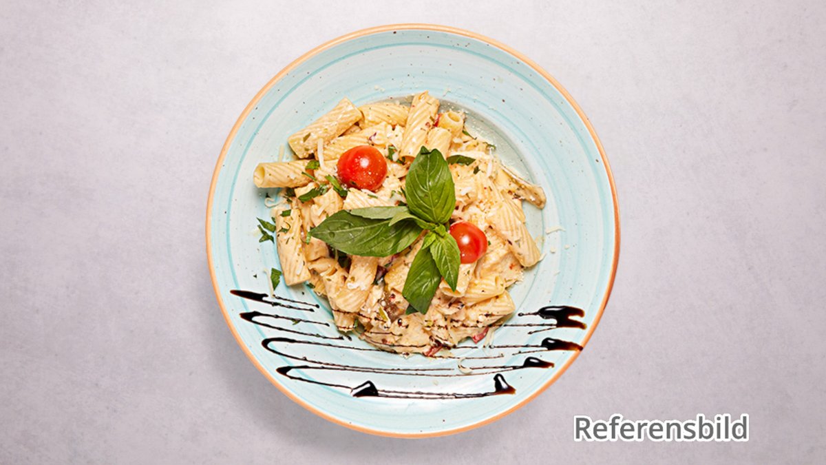 Nystekt bacon, rödlök, parmesan, mixsallad, cocktailtomater. Serveras med nybakat bröd och ceasardressing.