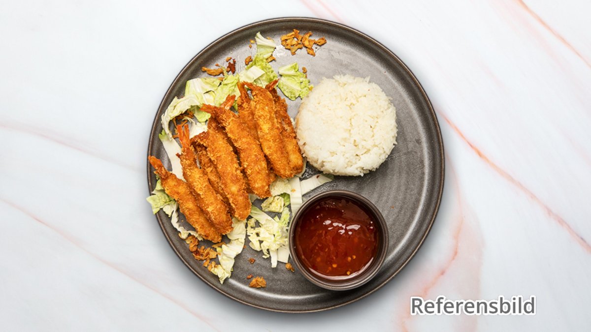 Stora handskalade räkor, citron, ägg, mixsallad, cocktailtomater, gurka, bröd och valfri sås.