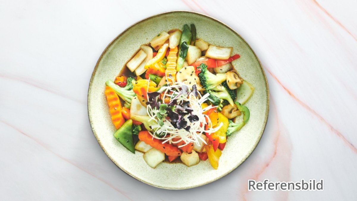 Wokad gul lök, paprika, chili, morötter, svamp, broccoli, thaibasilika och ostronsås.