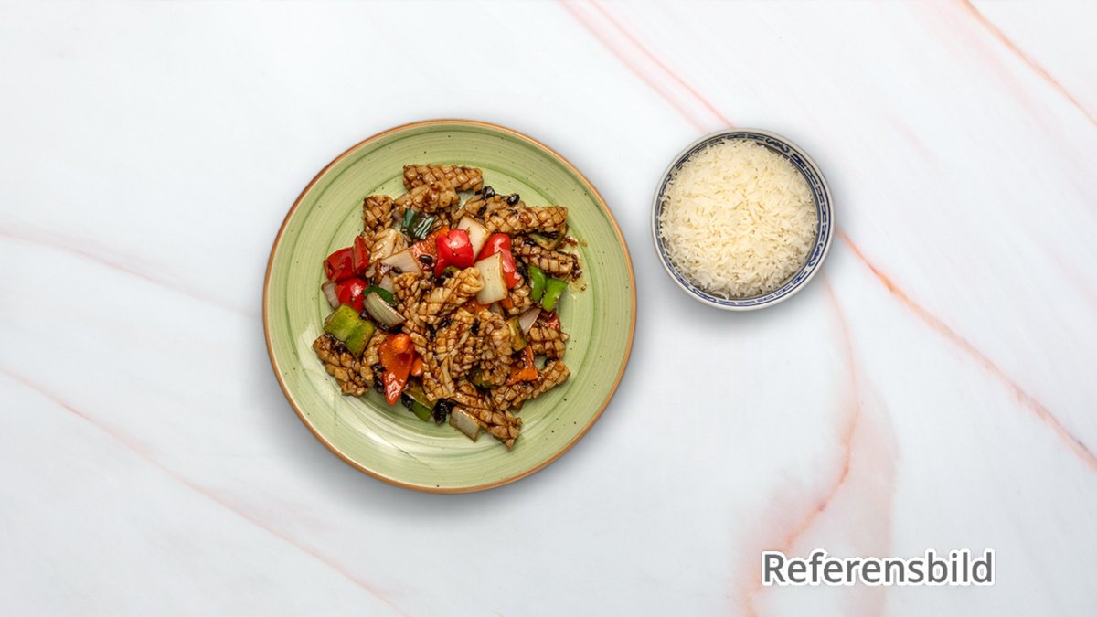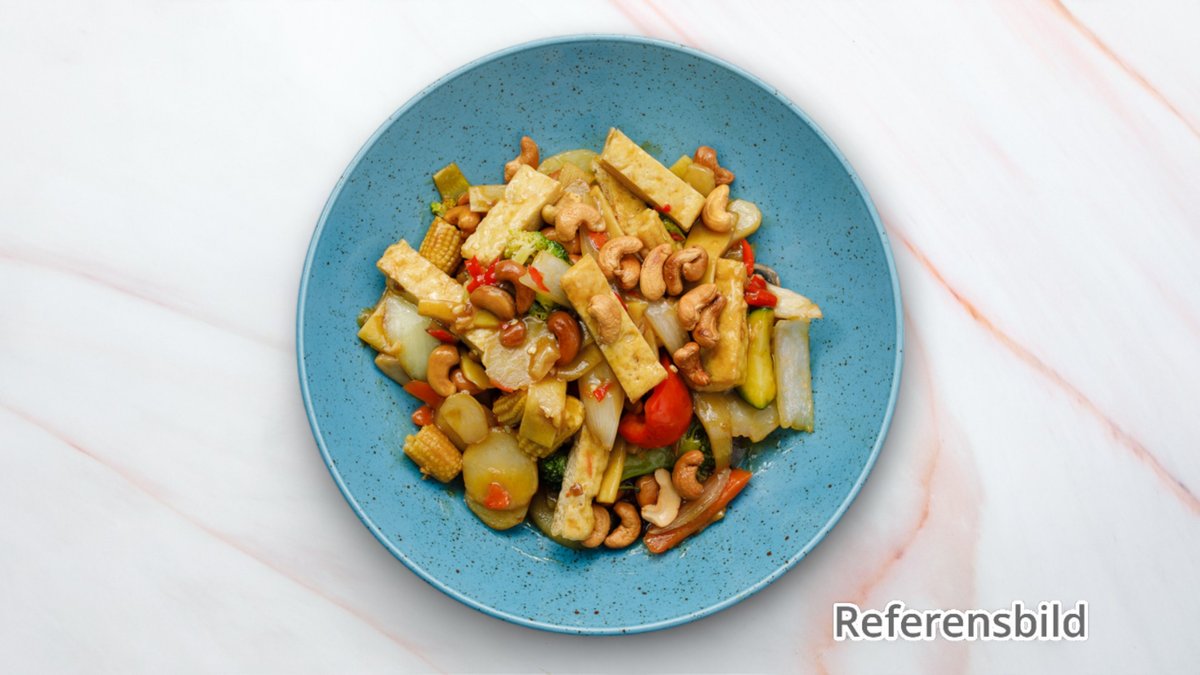 Wokad röd currypasta, gul lök, paprika, bambuskott, ostronssås och thaibasilika.