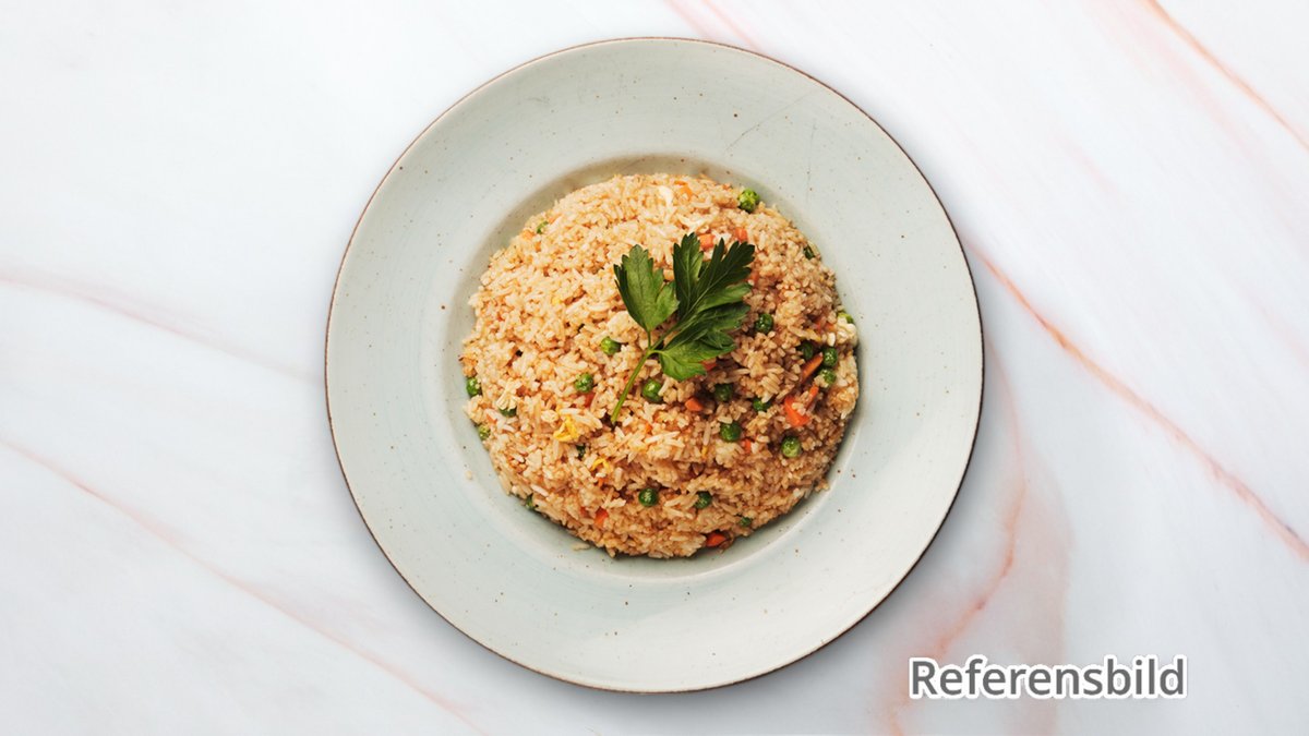 Stekt ris med ägg, broccoli, gul lök, morötter, ananas, tomat, citron och koriander.
