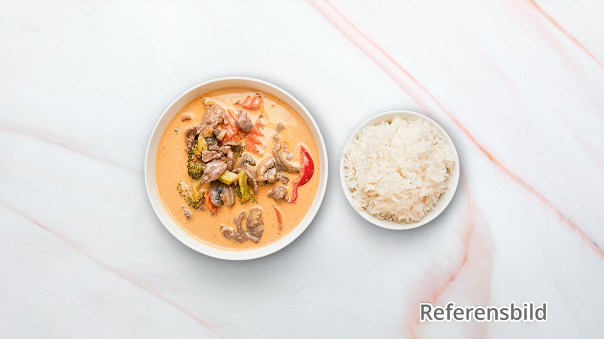 Panang-currypasta, kokosmjölk, gul lök, morötter, paprika och limeblad.