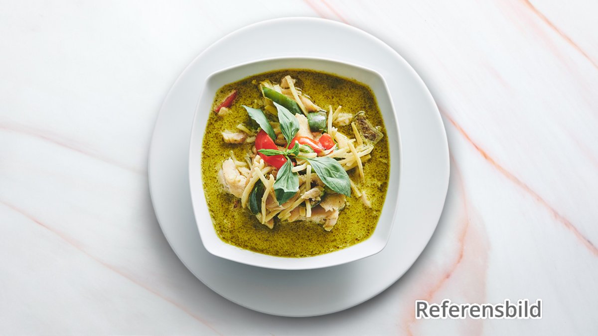 Grön currypasta, kokosmjölk, gul lök, paprika, morötter, bambuskott och thaibasilika.