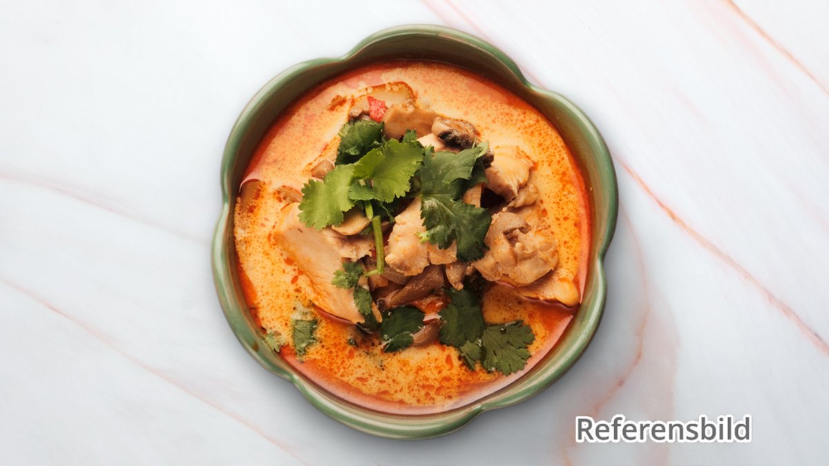 kryddad kokosmjölk, limeblad, citron, cirongräs, svamp. koriander, chilipasta, gul lök och tomater.