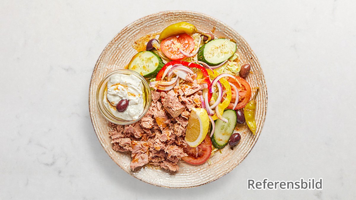 Tonfisk, lök, citron, majs, ägg, mixsallad, cocktailtomater, gurka, bröd och valfri sås.