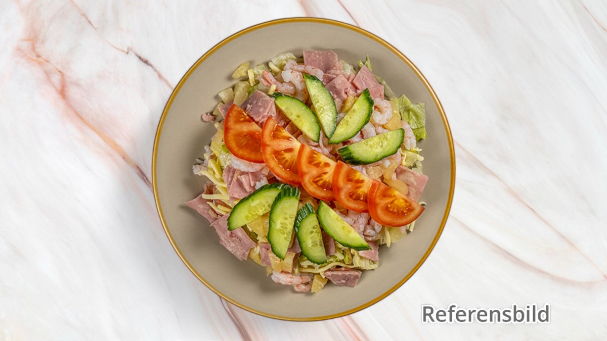 Skinka, ost, majs, ägg, ananas, mixsallad, cocktailtomater, gurka, bröd och valfri sås.