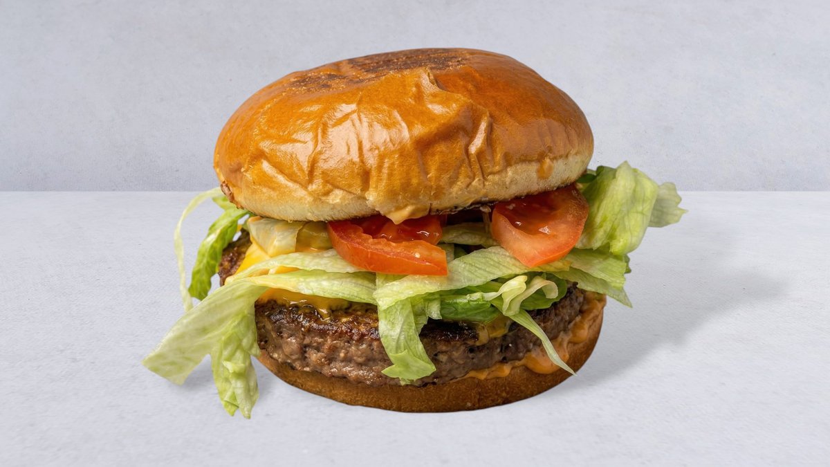 Briochebröd, 150 g smashad pattie, dubbel cheddarost, isbergssallad, tomat, lök, pickles och dressing.