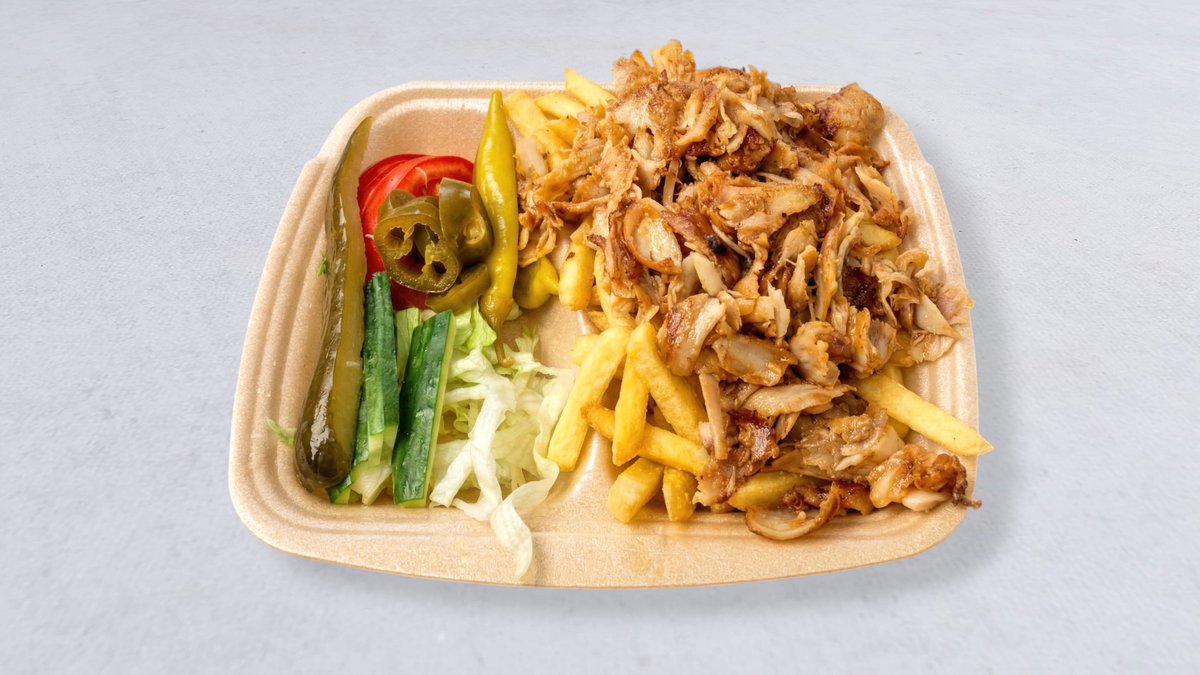 Isbergssallad, saltgurka, jalapeño, tomat, feferoni, pommes, kycklingkebab och vitlökssås.