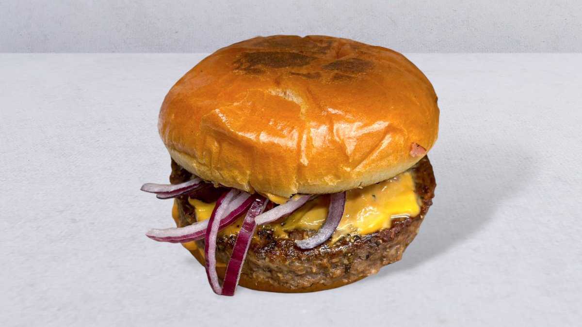 Briochebröd, trippel patties 300 g, trippel cheddarost, karamelliserad lök och dressing.