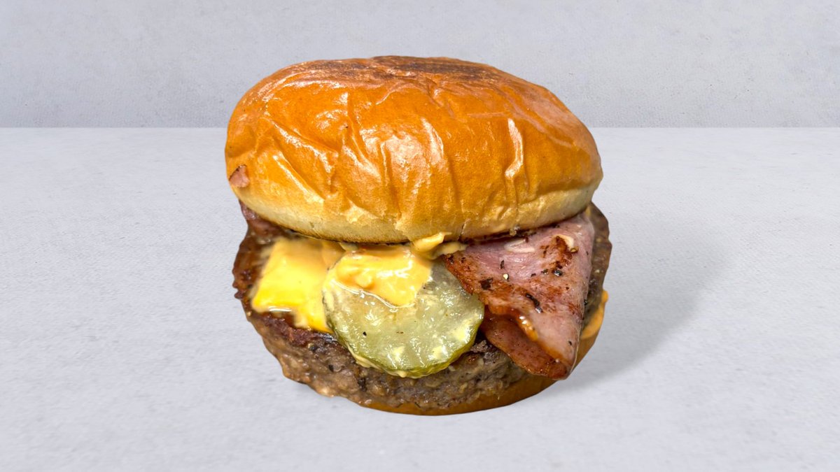 Briochebröd, 150 g smashad pattie, bacon, dubbel cheddarost, pickles och dressing.