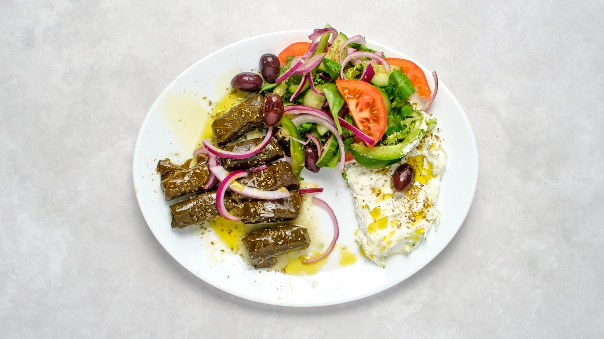 Vinblad, olivolja, ris, persilja, citron, mynta, fetaost, pitabröd och kalamata- & halkidikioliver.