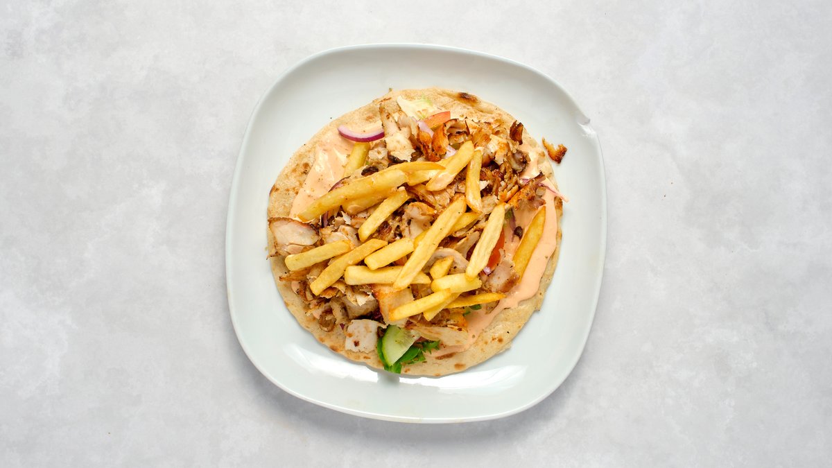 Kyckling, pommes, tomat, sallad, rödlök, chefsås och pitabröd.