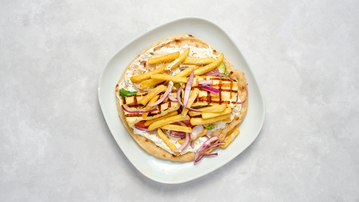 Grillad halloumi, pommes, salladsmix, rödlök, tzatziki, htipiti, pitabröd, fetaost och kalamata- och halkidikioliver.