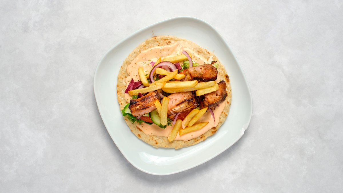 Marinerat grillspett, pommes, tomat, sallad, rödlök, pitabröd och chefsås.