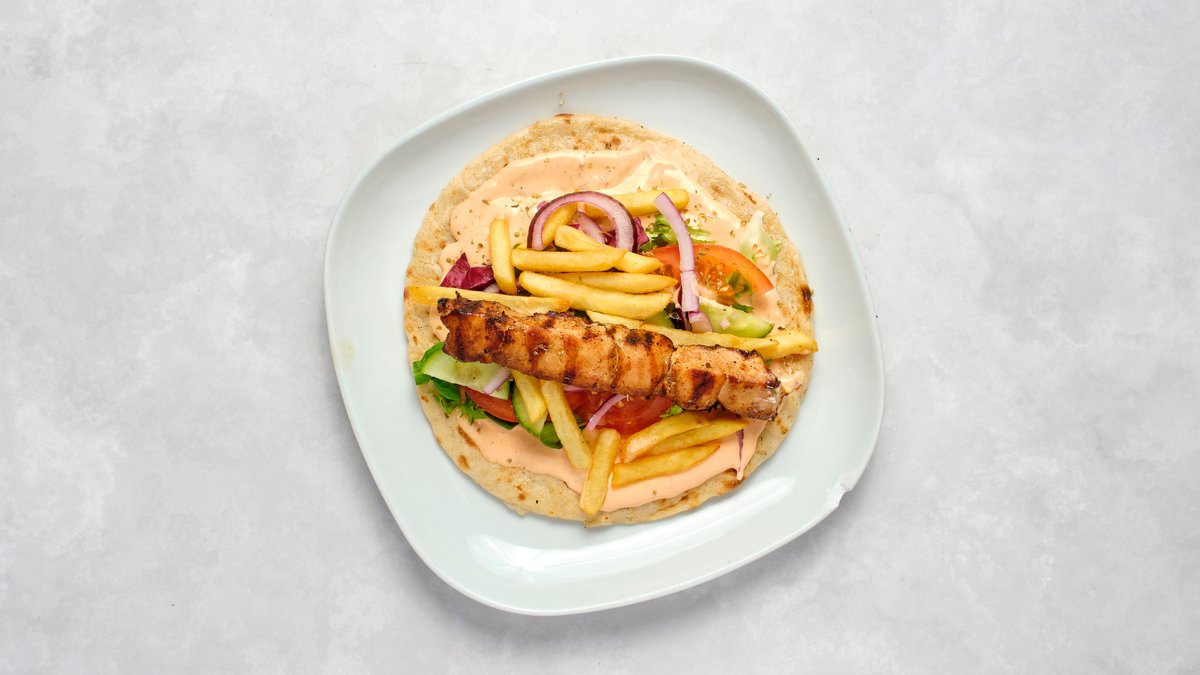 Marinerat kycklingfiléspett, pommes, tomat, sallad, rödlök, pitabröd och chefsås.