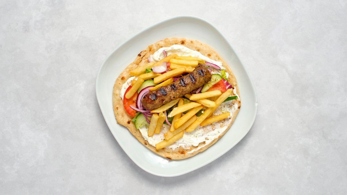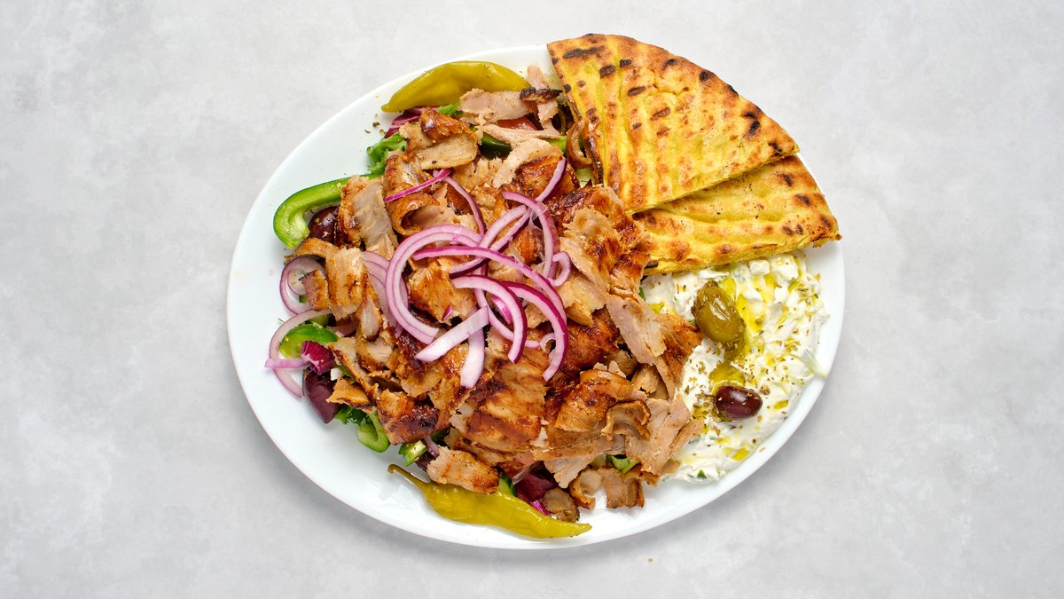 Gyroskött, tomat, gurka, salladsmix, rödlök, kalamata- och halkidikioliver, tzatziki och pitabröd.