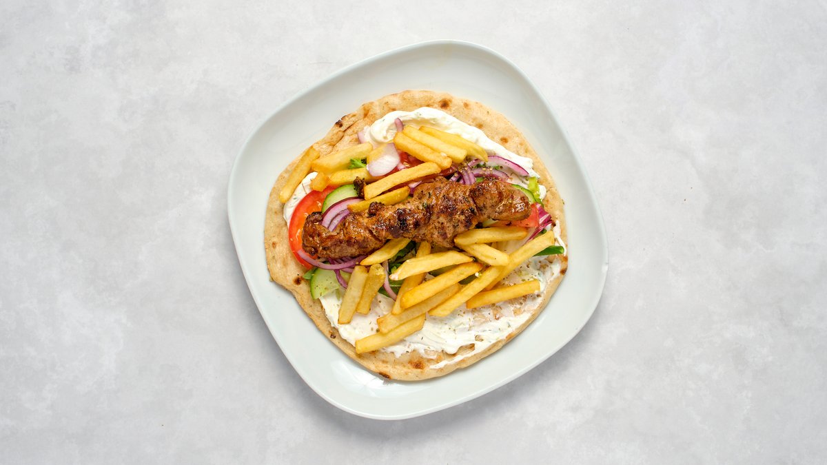 Två marinerade kycklingfiléspett, pommes, salladsmix, rödlök, kalamataoliver, chefsås, fetaost och pitabröd.