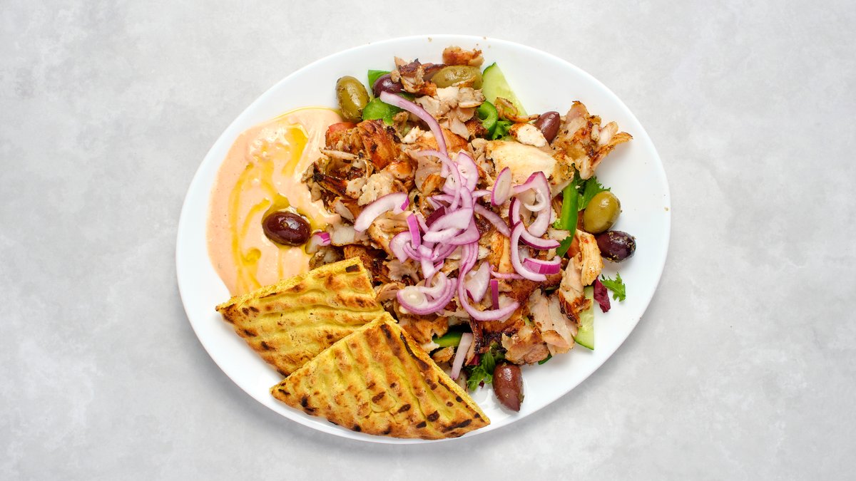Kyckling, pommes, salladsmix, rödlök, kalamataoliver, chefsås och pitabröd.