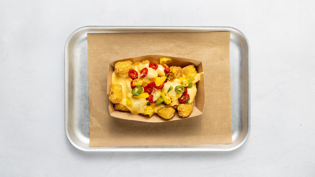 Baconlindad ost, chilichorizo med färskostkräm, rostad majs, grillade grönsaker, baconkrisp, het chilisås, chipotleaioli och koriander.