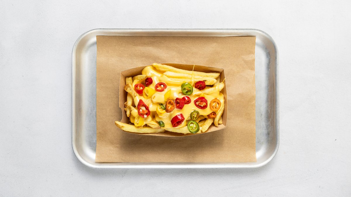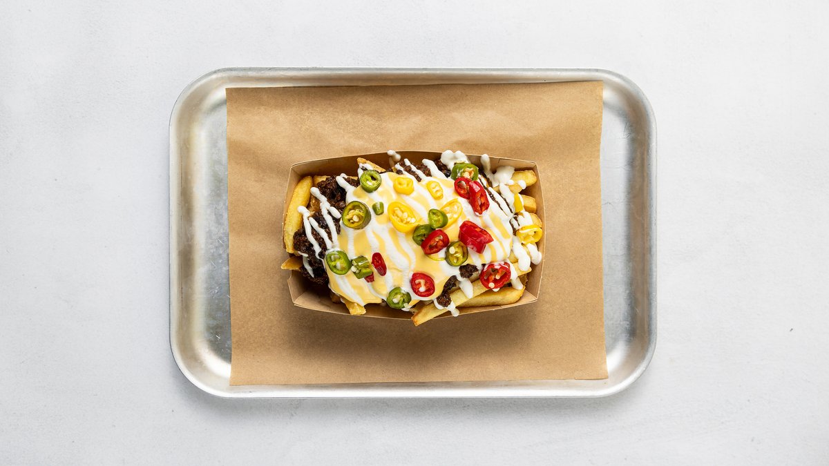 Hot dog med texas chilisås, ostsås och picklad chili.