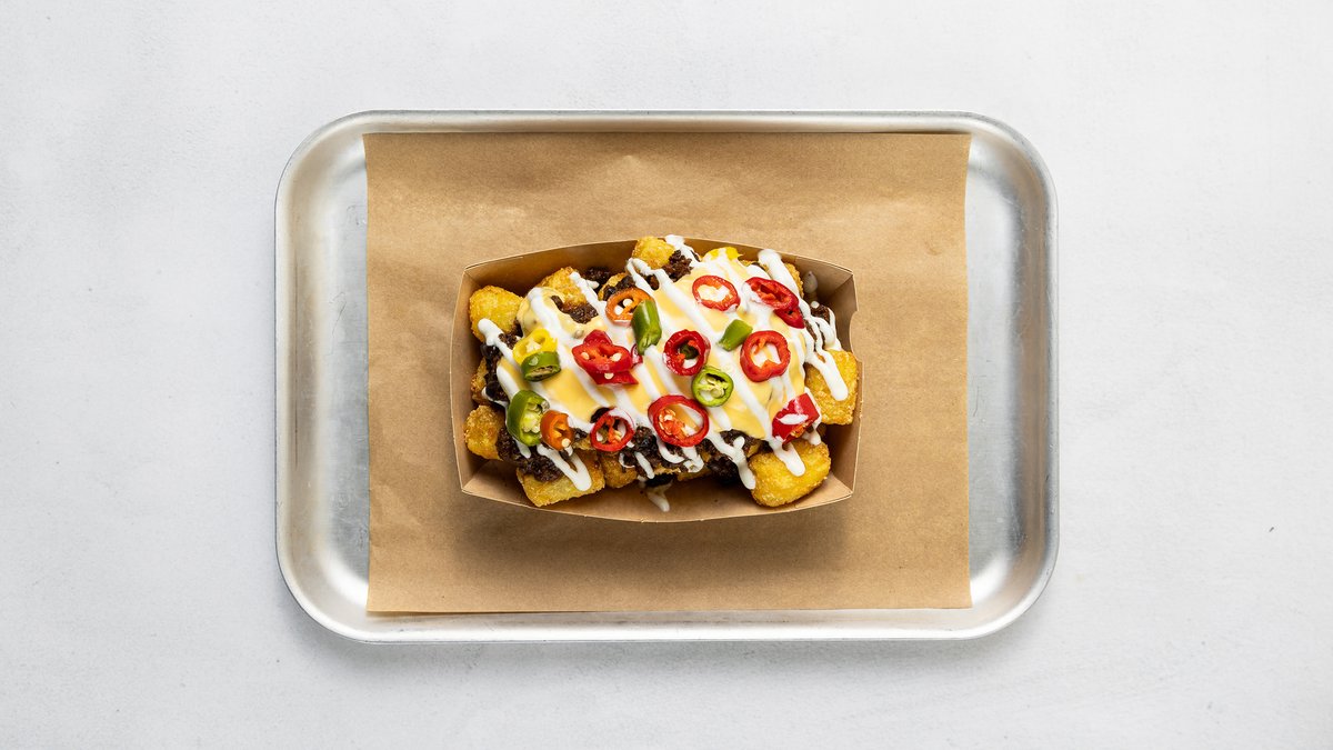 Baconlindad ost, chilichorizo med färskostkräm, rostad majs, grillade grönsaker, baconkrisp, het chilisås, chipotleaioli och koriander.