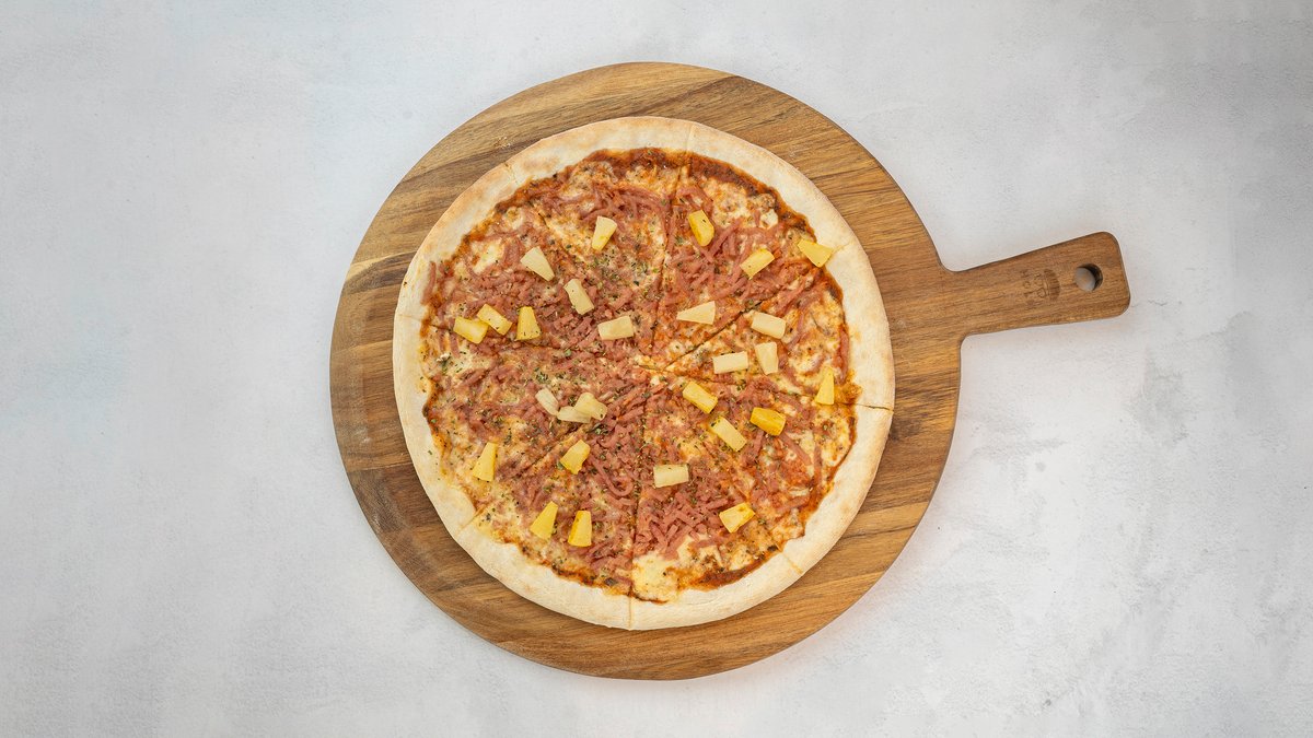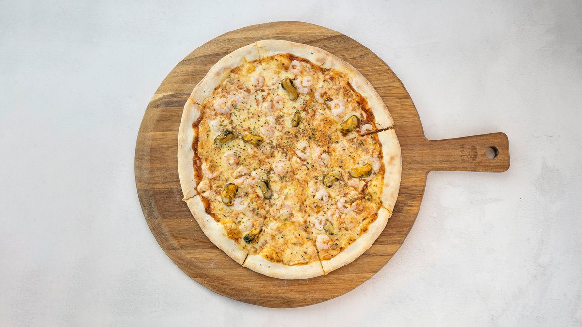 Räkor, champinjoner, isbergssallad, tomat, oliver, ananas, paprika och valfri sås.