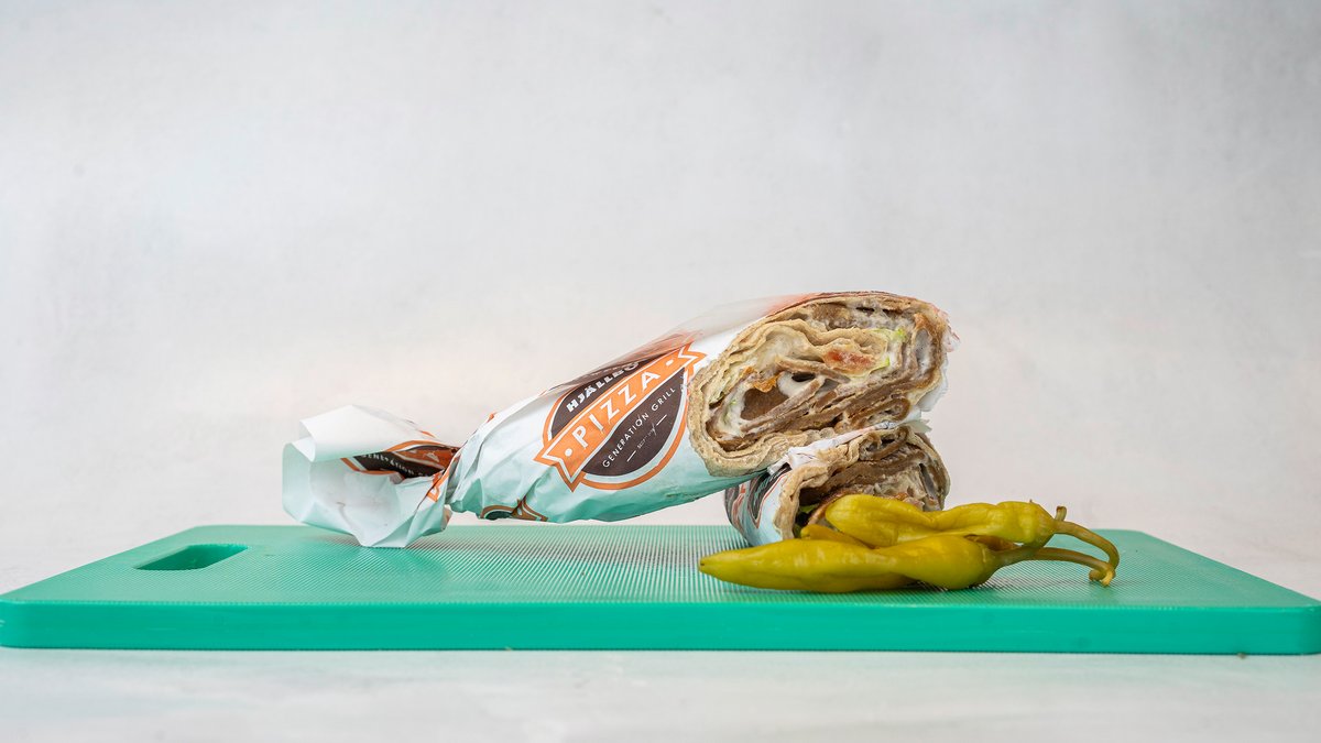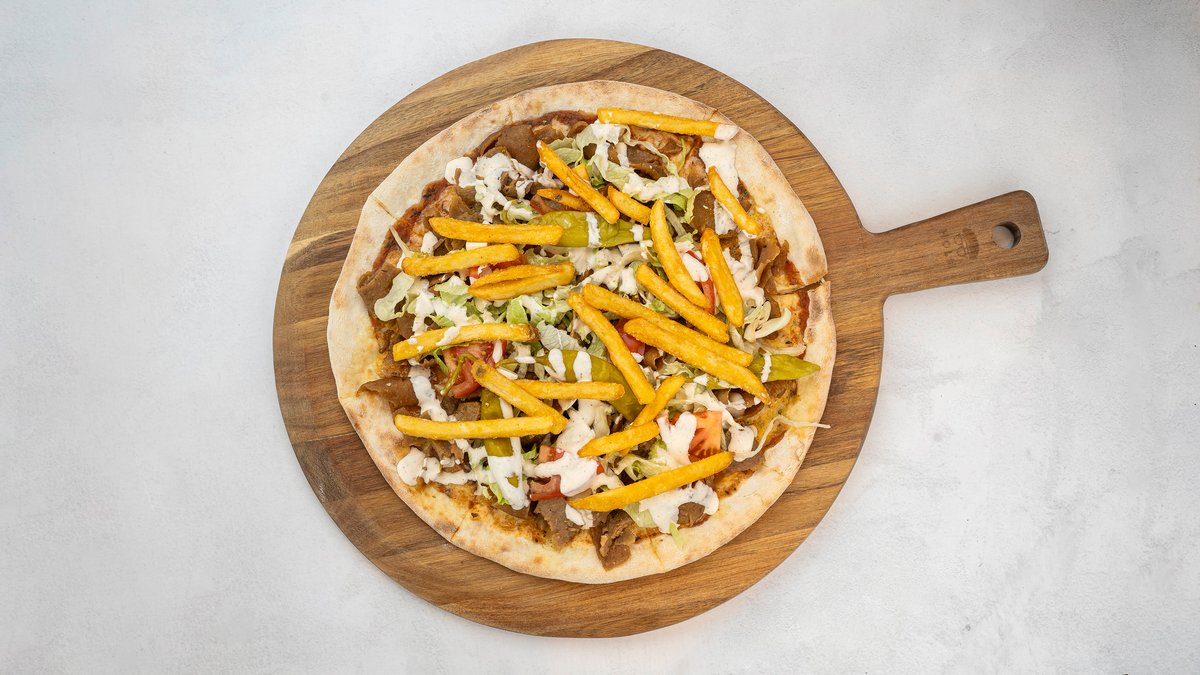 Tomatsås, ost, shawarma kött, persilja, lök, tomat, feferoni och sesamsås.