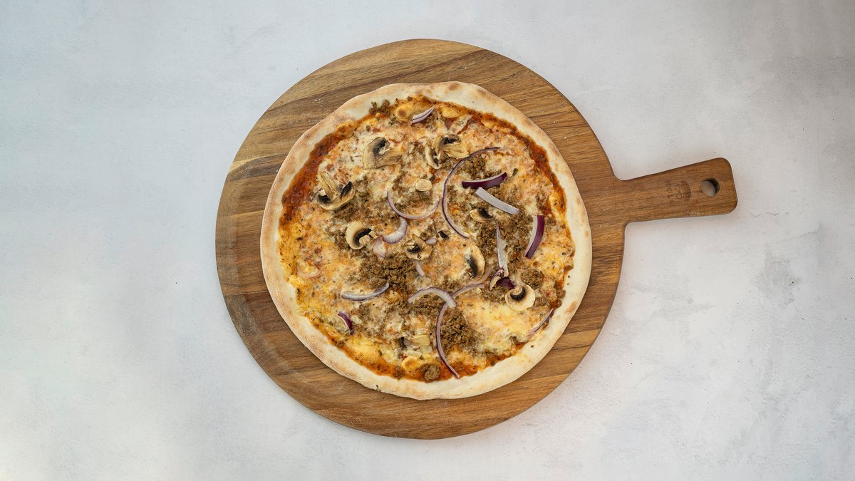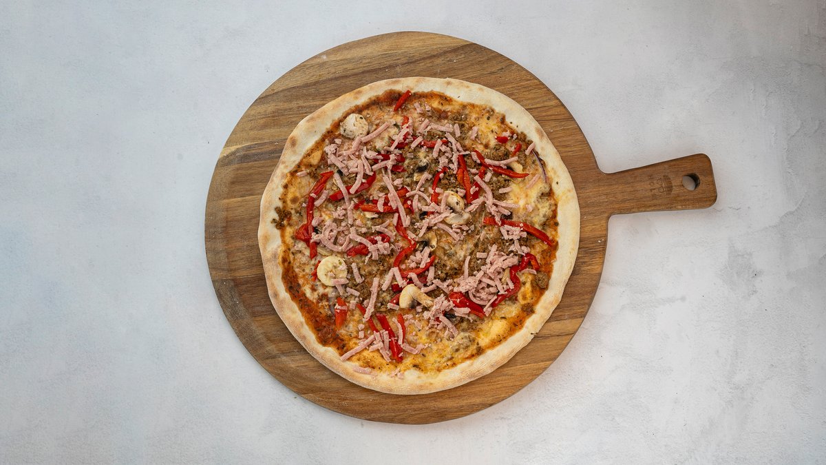 Kebabkött, champinjoner, isbergssallad, tomat, oliver, ananas, paprika och valfri sås.