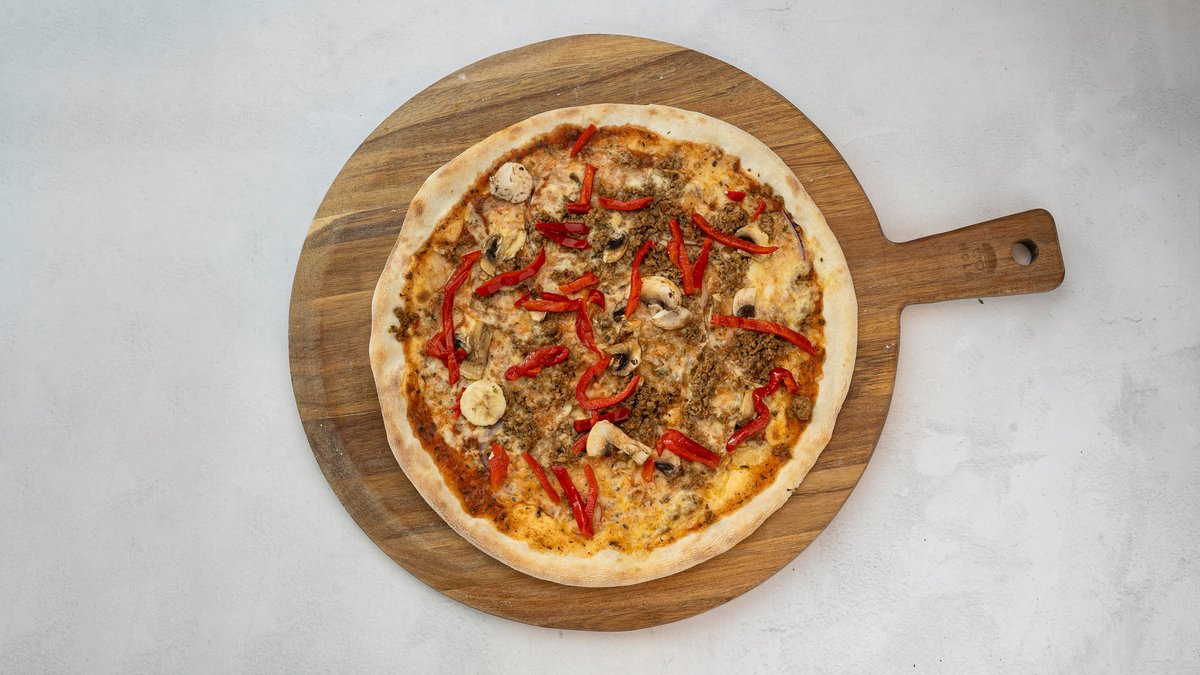 Tonfisk, champinjoner, isbergssallad, tomat, oliver, ananas, paprika, lök och valfri sås.