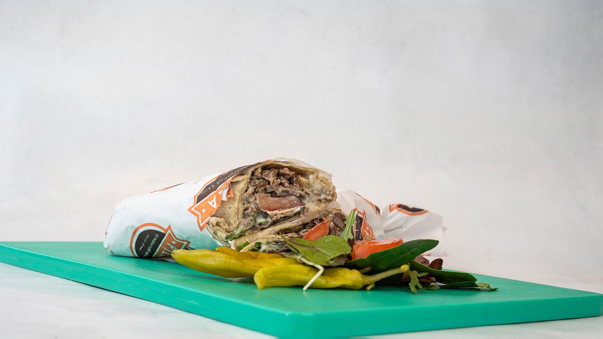 Kebab, kyckling, feferoni och valfri sås. Välj tillbehör i nästa steg.