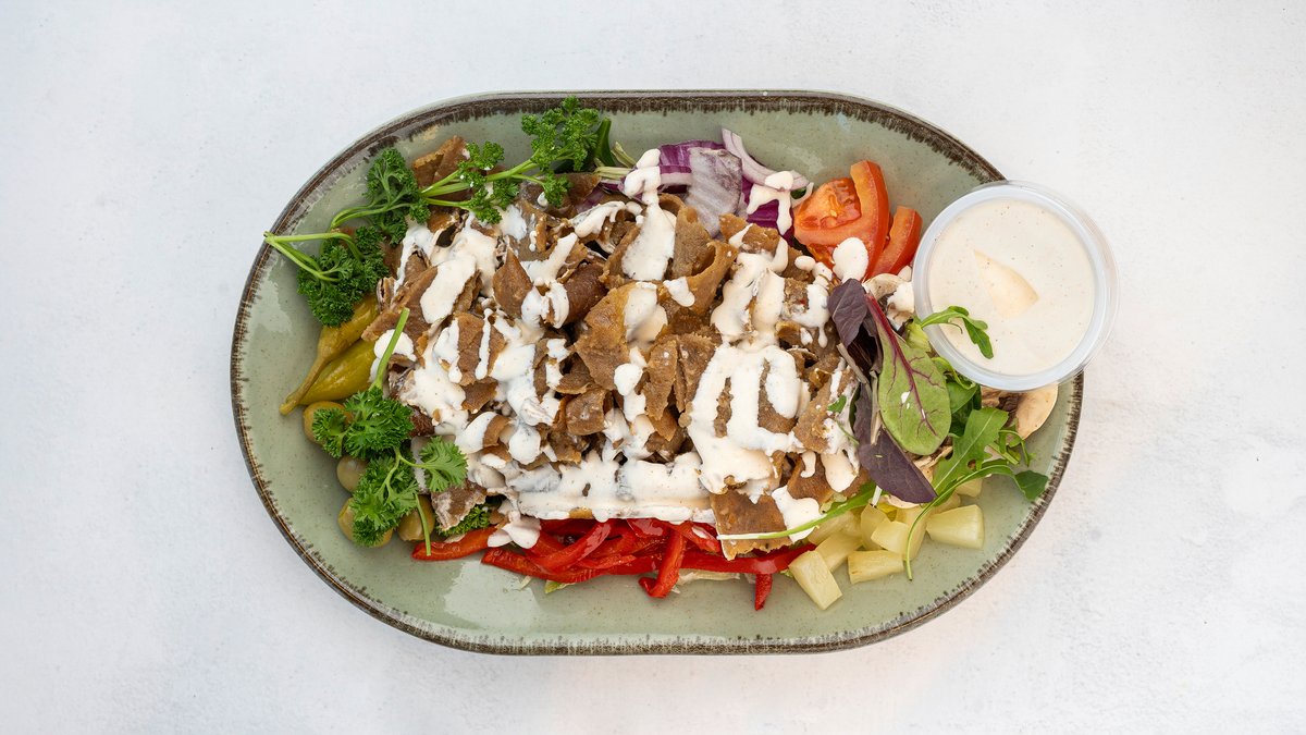 Nöt-och lammkött, sallad, lök, tomater och sesamsås. Välj tillbehör i nästa steg.